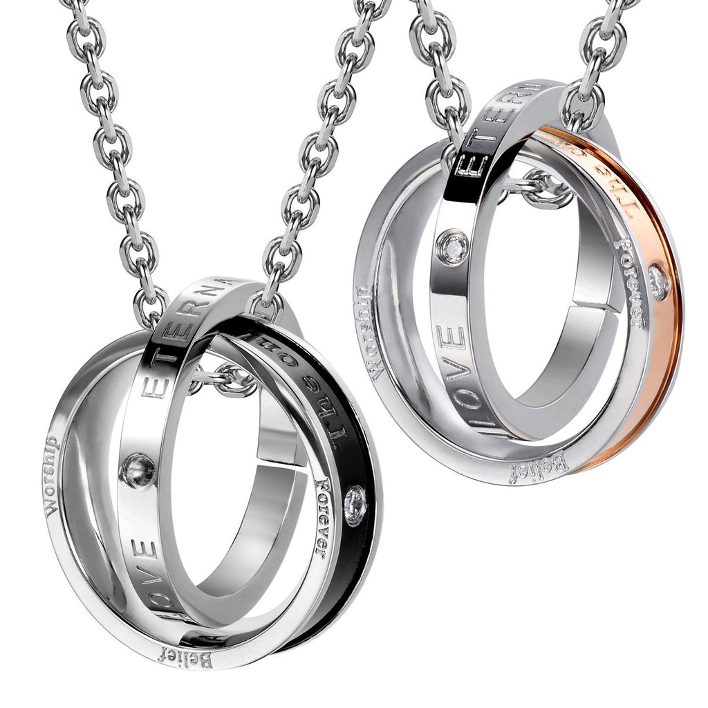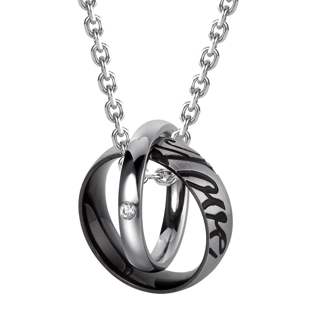His & Hers Couples Engraved Double Ring Pendant Necklace