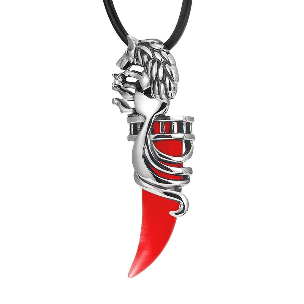 Tribal Wolf Stainless Steel Mens Necklace Pendant 19" Leather Chain (Silver Red)