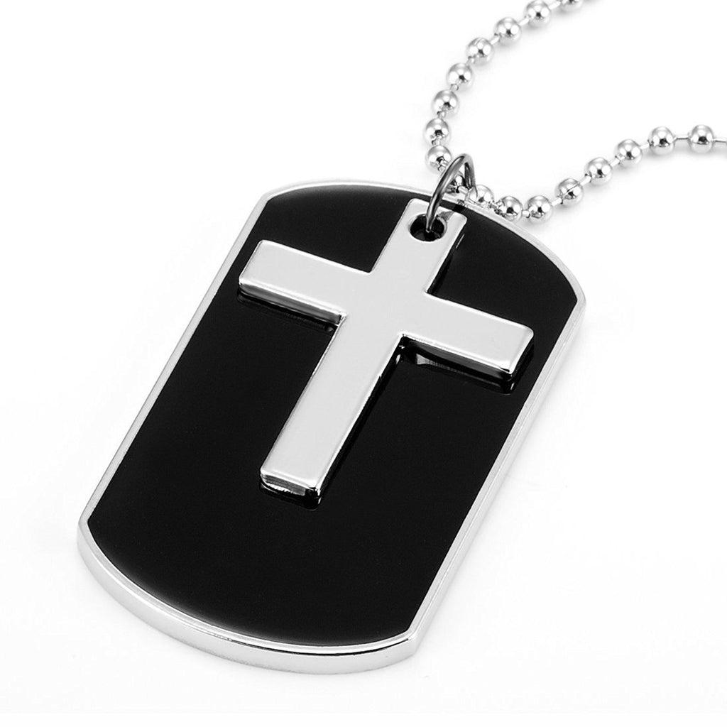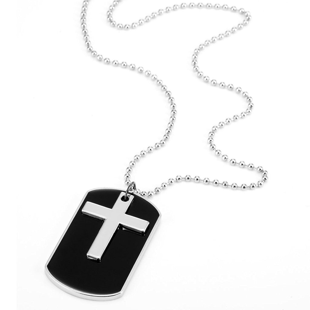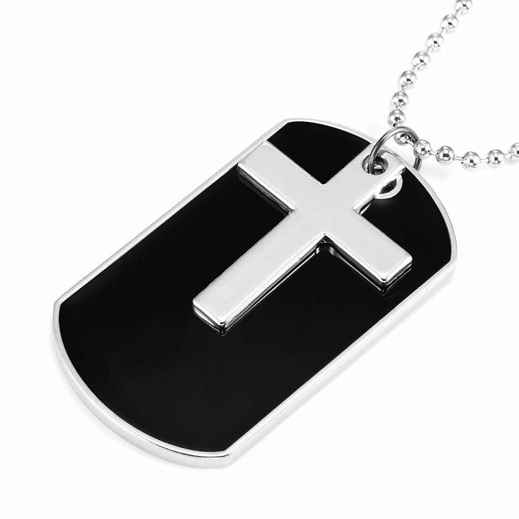 Unique Army Style Black Dog Tag Silver Cross Pendant Mens Necklace, 30 inch Adjustable Chain