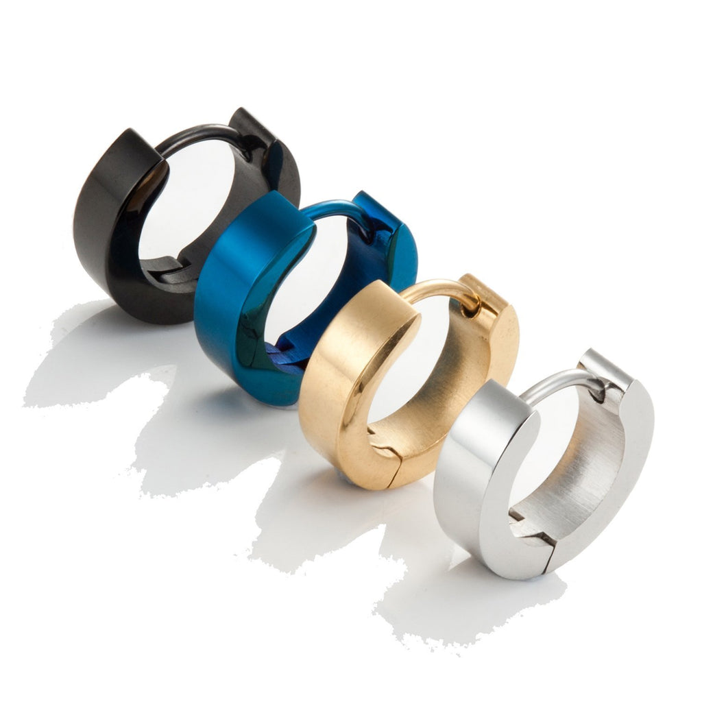 Set of Mens 316L Stainless Steel Classic Huggie Hinged Hoop Earrings - Includes 4 Pairs of Earrings for Men - Black, Blue, Gold and Silver Hoops for Men