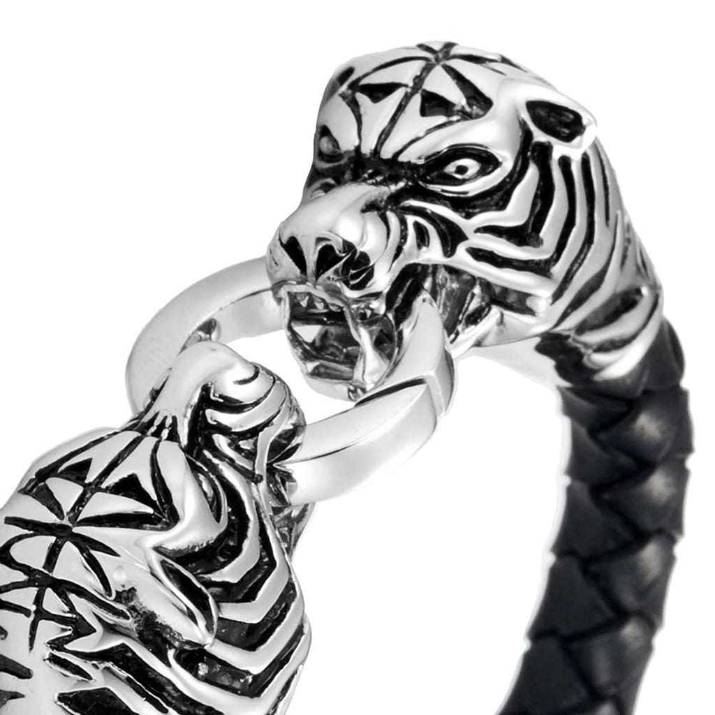 Amazing Leather Mens Bracelet with Locking Stainless Steel Tiger Head Clasp, Black, Silver, 8.5 Inches