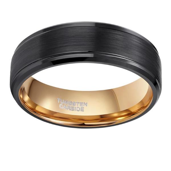 The black brushed tungsten ring comes with a gold interior. The clean surface of the ring is unique and luxurious. The brushed surface adds extra luxury to the ring. Because tungsten carbide is 10x harder material than gold, you can rest assured the ring will endure daily use with ease. The simple looking ring comes with a wide attribute variety. 100% Tungsten carbide as material, the ring is among the most durable on the market, and with a golden interior and a brushed surface, the ring is a unique masterpiece. This ring separates itself from other standard black rings by a mile. This must-have pitch black ring with 24k gold tungsten interior plays with a mixture of smooth, shiny surface and a beautiful brushed matte finish. Wear on any occasion, day or night, casual or formal.