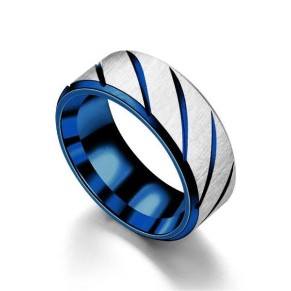 Blue Stripes on Matte Silver Stainless Steel Ring Band