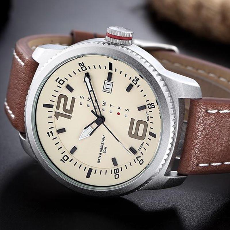 Item Type: Quartz wrist watchClasp Type: BuckleBand Material: LeatherBand Length: 25.5 cmWatch Case Material: AlloyWatch Face Diameter: 48 mmFunctions & Features: Complete Calendar, Auto DateWater Resistance: 3 BAR (not suitable for swimming)