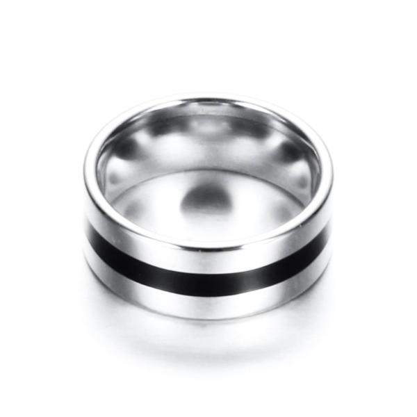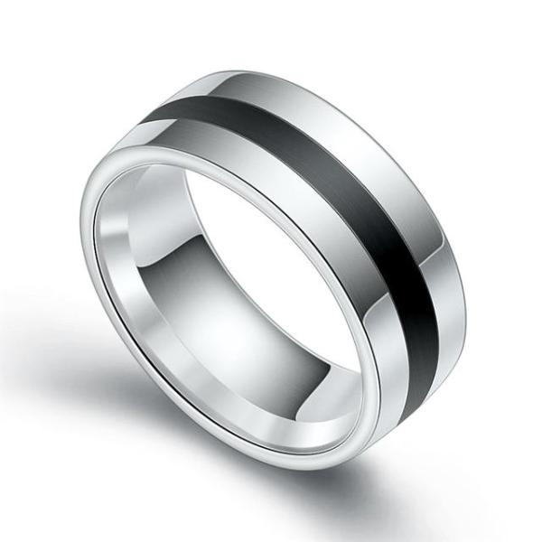 The striped ring with the edges made of silver stainless steel and the middle section is pitch black steel. This simple stainless steel ring is among the most popular casual men's rings today. A durable ring made for daily use. If you are looking for a ring for everyday use with casual outfits, this is definitely one of the best options. A true gentleman's ring!