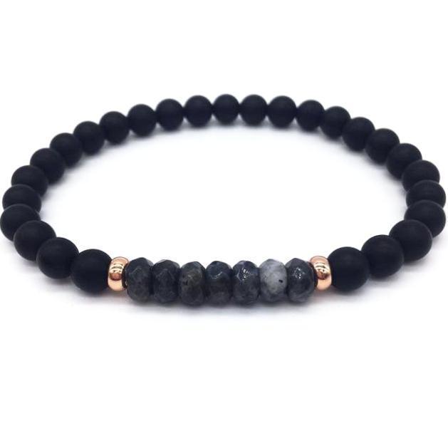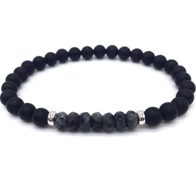 The Sacred Silver Slim Stone Bead Bracelet is an elegant choicefor all Sacred Silver. Its beautiful black matte beads are complemented with a row of grey oval natural stone beads separated with two precious metal colored beads. This bracelet will take your attire to a next level whether you wear it daily or just for special occasions. Choose yourfavorite metal color from gold, silver, rose gold or black gunmetal.