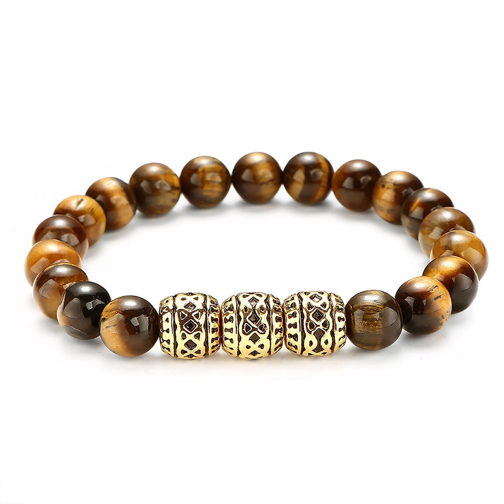 - WEAR IN STYLE: This stylish and beautiful bracelet is made of tiger eye stone beads and three Stainless Steel Gold color beads. The beads are brown with a yellow tint