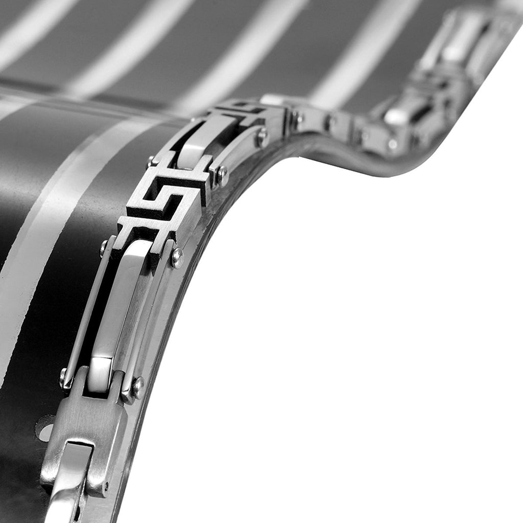The bracelet features large horizontal bar links with rivet accents and geometric Greek key links in an alternating design.